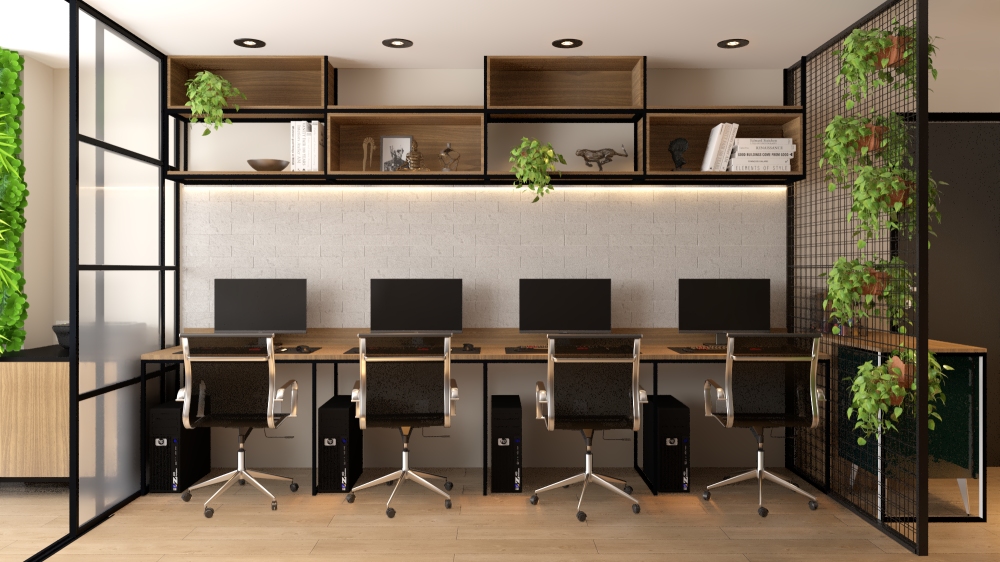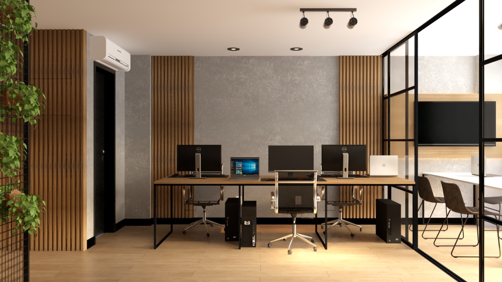 O layout estratégico direciona a mesa dos colaboradores voltadas para a parede para otimizar espaço. As mesas dos sócios oferecem visão completa do escritório, com espaço na parede atrás deles podendo incluir e dar destaque para seus logos. Elementos decorativos como nichos, divisória em tela aramada e vegetação promovem estética atraente. A área de espera para clientes inclui mesa de café, frigobar e poltronas confortáveis. Na sala de reuniões com divisória de vidro, mesa em pedra branca, TV e jardim vertical, atendendo critérios de estética, funcionalidade e conforto no estilo industrial geral do escritório.
