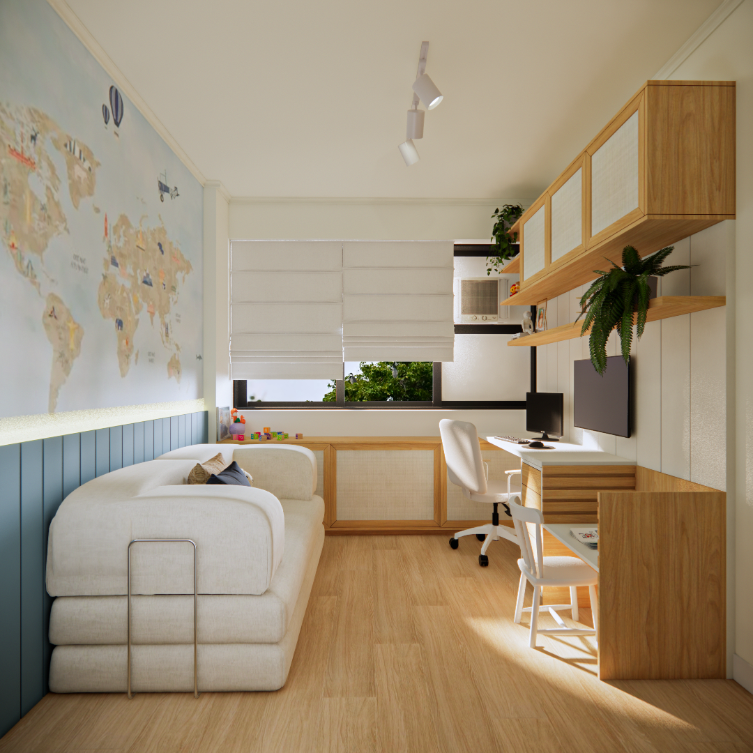 Foi um prazer projetar esse cantinho especial para a vovó Rosa e o netinho Caetano! Nesse ambiente possui uma mesinha montessoriana que se adapta ao crescimento da criança e um sofá-cama montessori que fica tão confortável para ele quanto para a Dona Rosa! Um ambiente agradável para essas duas gerações!