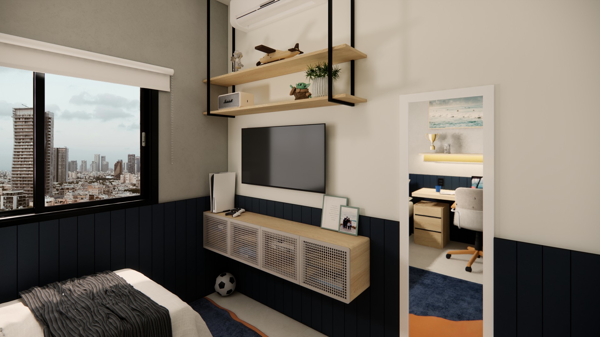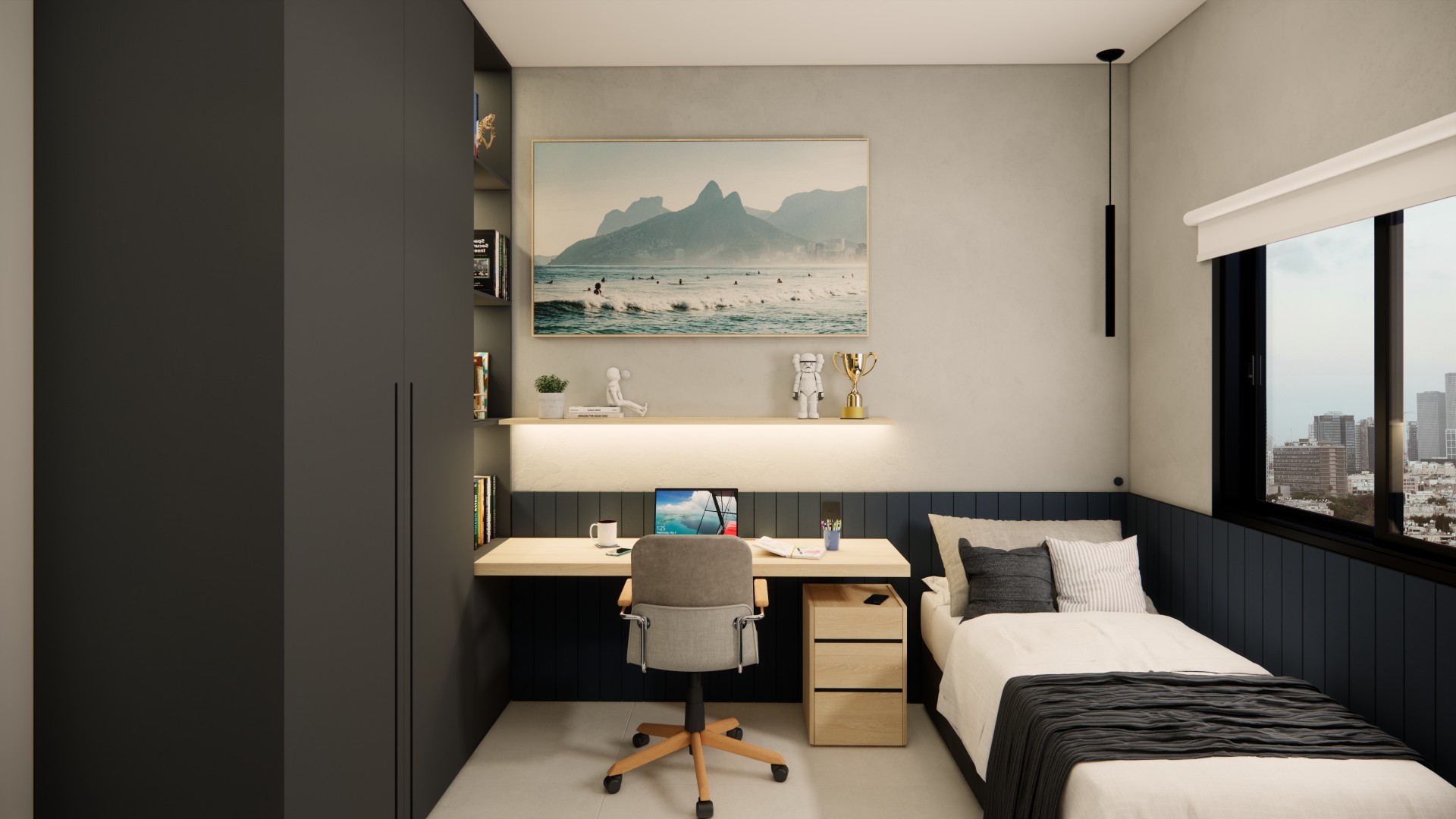 Quarto dos sonhos para um jovem adolescente! 💙 Neste projeto, criamos um espaço que oferece o equilíbrio perfeito entre descanso, diversão e estudos!
